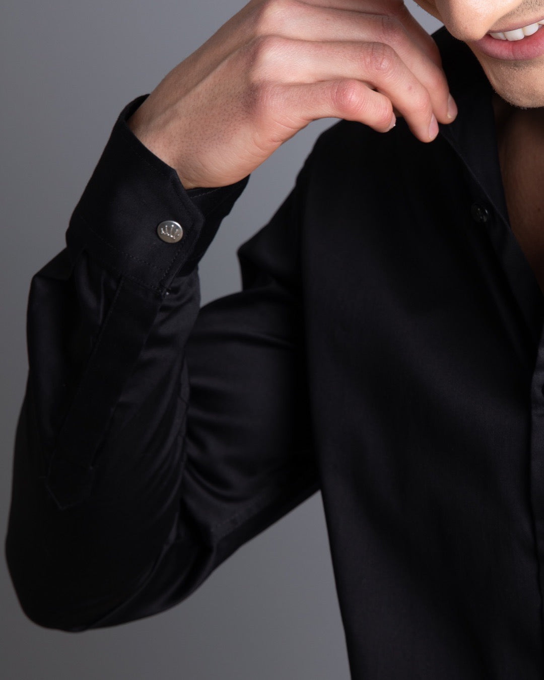 100% Premium Cotton Sateen. Tailored fit, sits perfectly on chest & tapers along the waist. Crown embossed, metal snap buttons at cuff. Light-weight, 2-way stretch fabric with natural sheen.